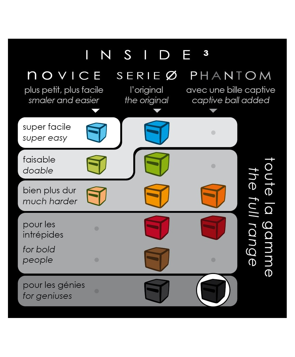 En la serie PHANTOM los laberintos están compuestos de 7 bandejas como la serie 0. Son todos cubos complicados o incluso muy complicados. En ellos siempre hay una segunda bola (el fantasma) que está ahí para hacerte la vida imposible.
